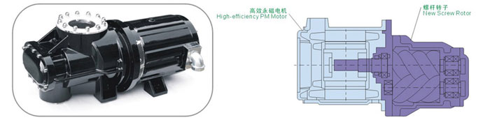 永磁電機與壓縮機主機采用內嵌式一體軸直連結構。